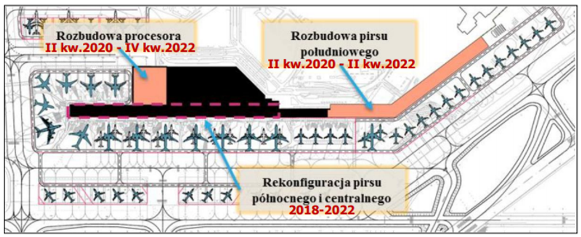 Jak się rozrośnie terminal pasażerski? Na trzech poziomach powiększy się w części dla podróżujących do strefy Non-Schengen, a więc z dodatkową kontrolą paszportową. Przy wydłużonym pirsie południowym dla strefy Schengen zmieści się zaś 15 nowych stanowisk dla samolotów. Zostanie dobudowany procesor sortowni, a kontrolę bezpieczeństwa usprawnią nowe urządzenia do skanowania bagaży.